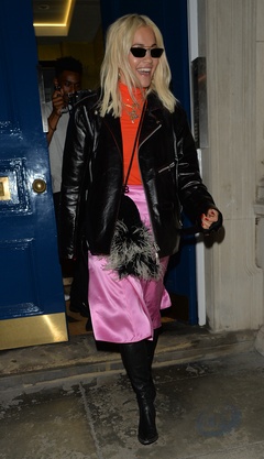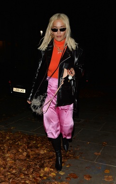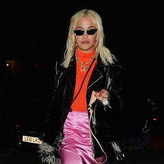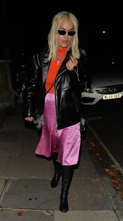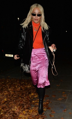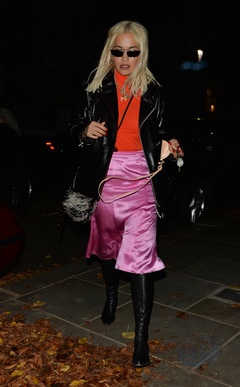 Rita Ora w rozowej spodnicy i pomaranczowej bluzce