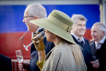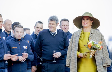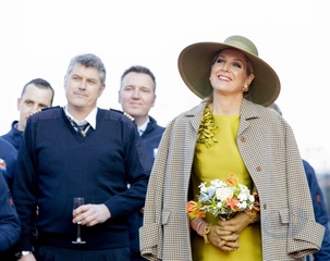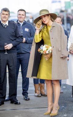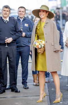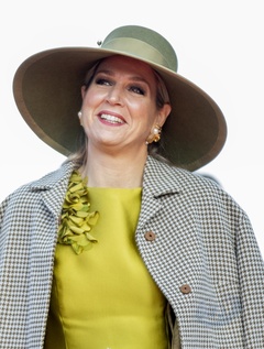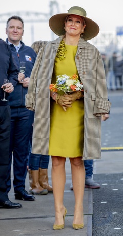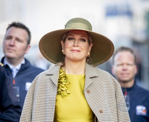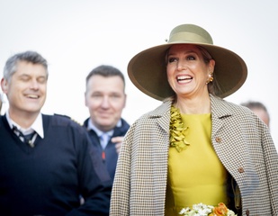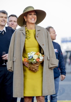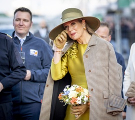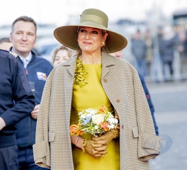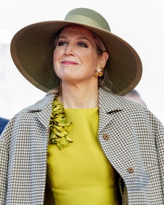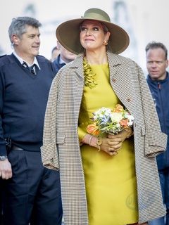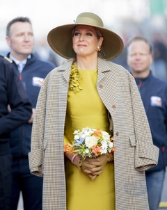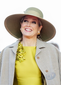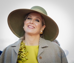 Krolowa Maxima w plaszczu w pepitke i w duzym kapeluszu