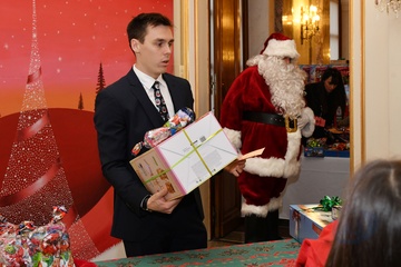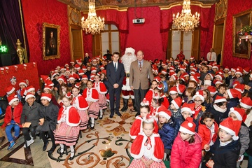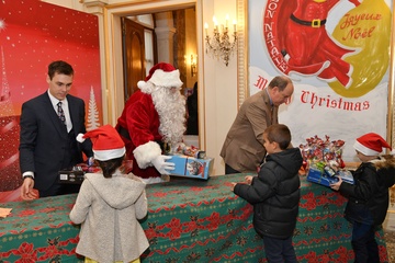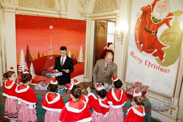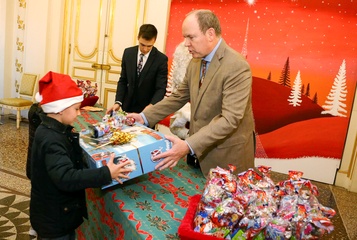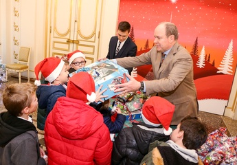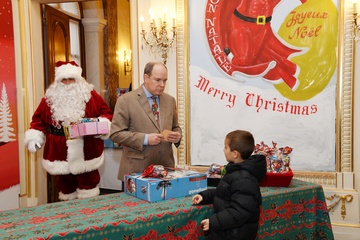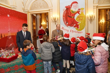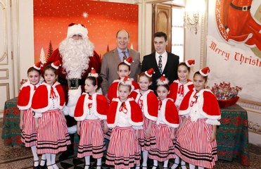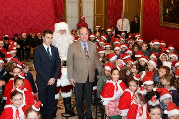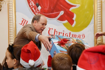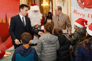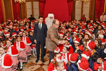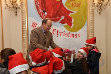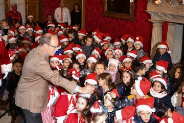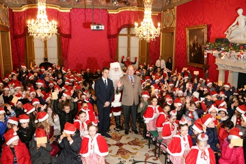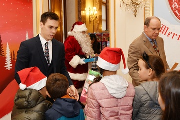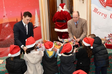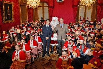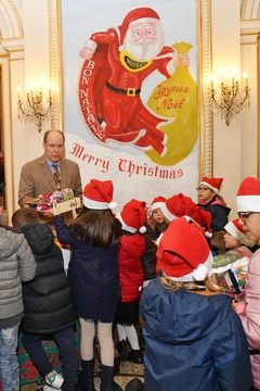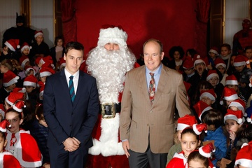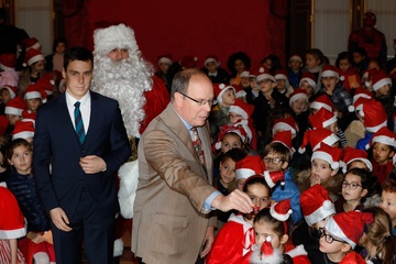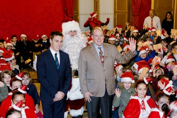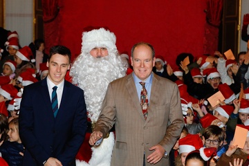 Ksiaze Albert i Louis Ducruet z dziecmi na spotkaniu swiatecznym