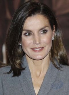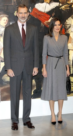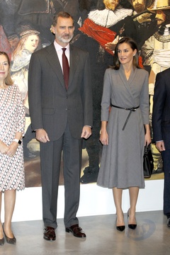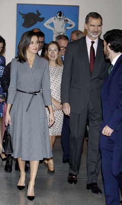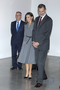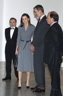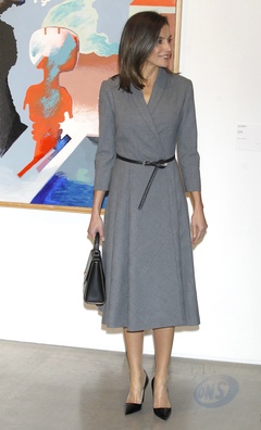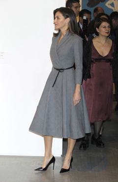 Krolowa Letizia w szarej, kopertowej sukience na wystawie (Poetics of Democracy. Images of the Transition)