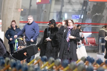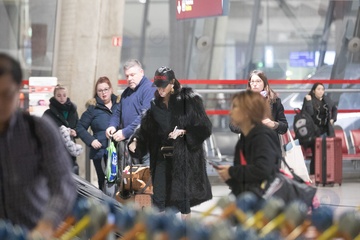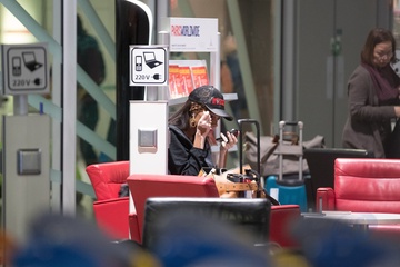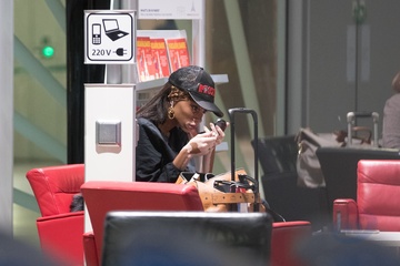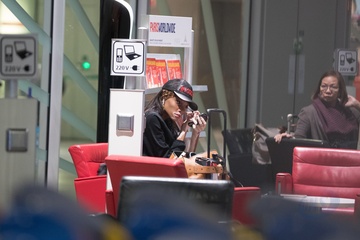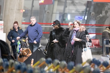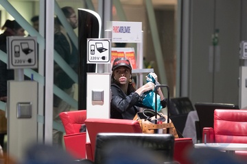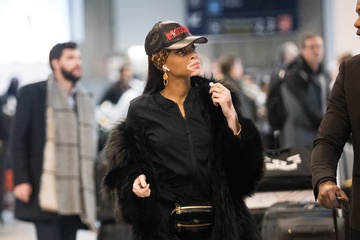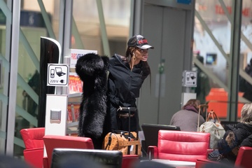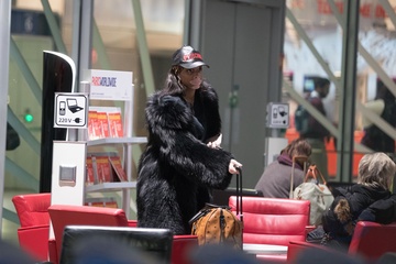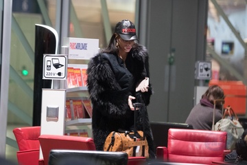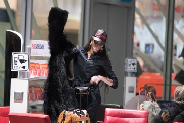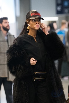 Winnie Harlow w czarnym futrze, maluje sie na lotnisku