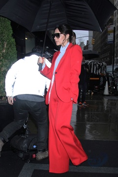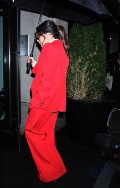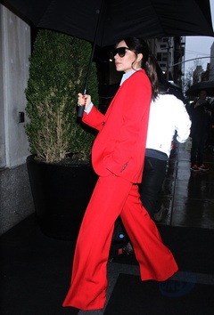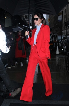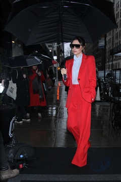 Victoria Beckham w czerwonym garniturze i z ogromnym parasolem