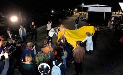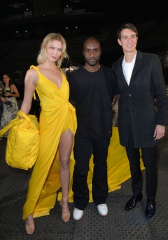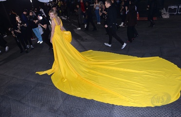 Karlie Kloss z ogromnym, zoltym trenem na backstage pokazu Off-White