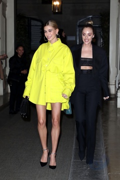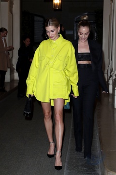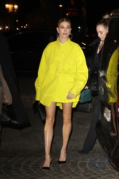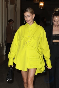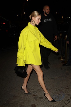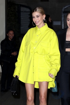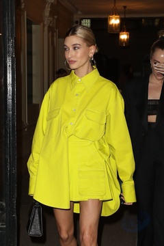 Hailey Baldwin w zoltej koszuli i z golymi nogami