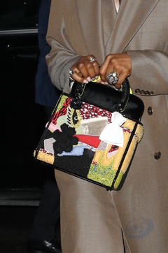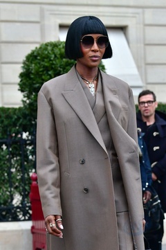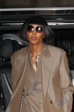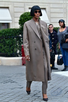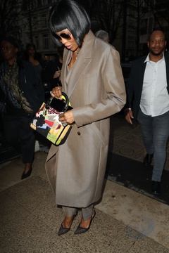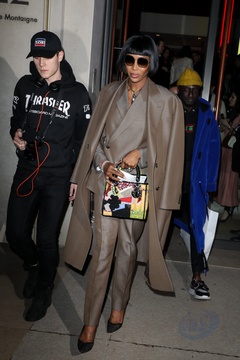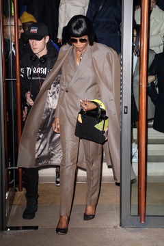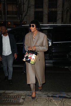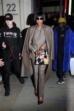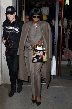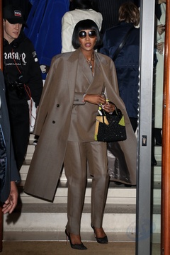 Naomi Campbell w eleganckim plaszczu i z kolorowa torebeczka