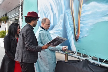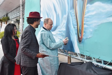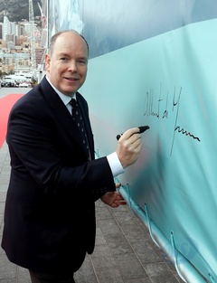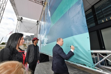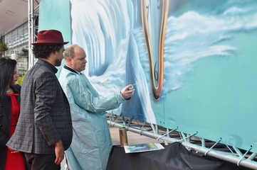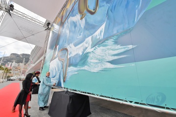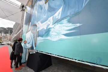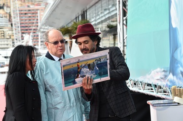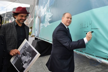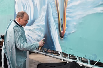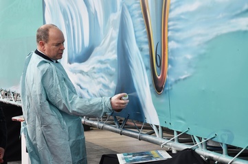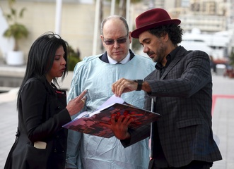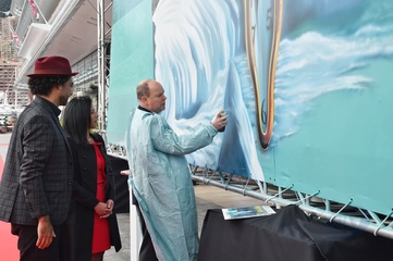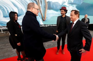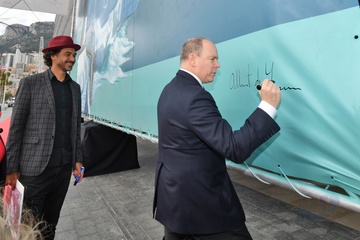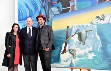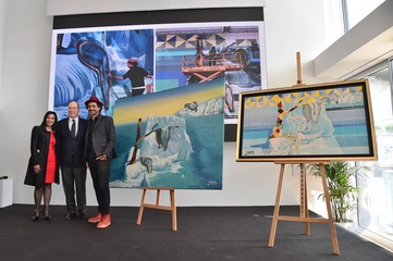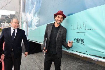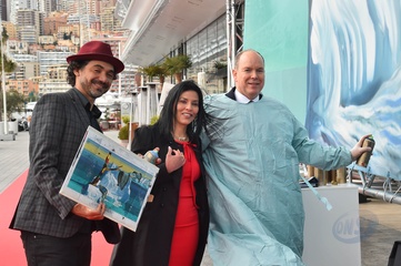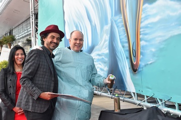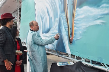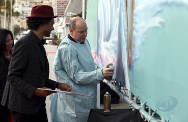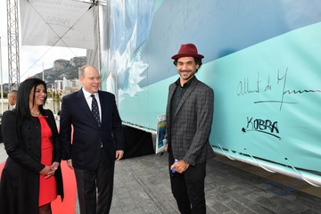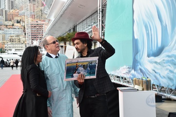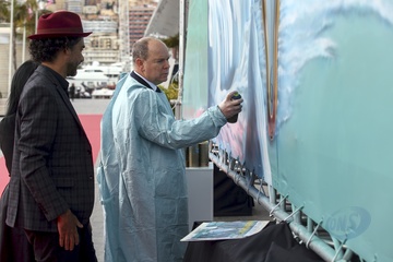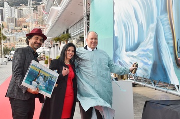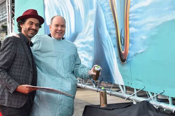 Ksiaze Albert II i Eduardo Kobra pozuja przy dziele artysty dla Yacht Club