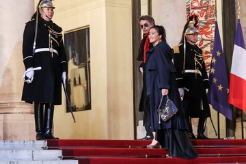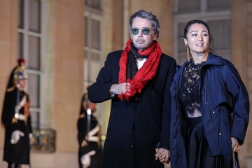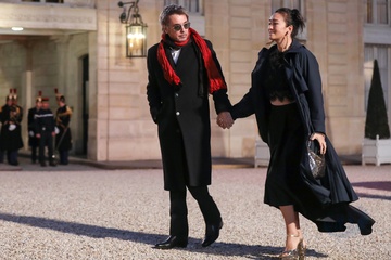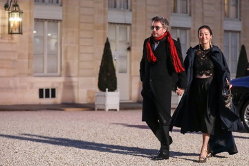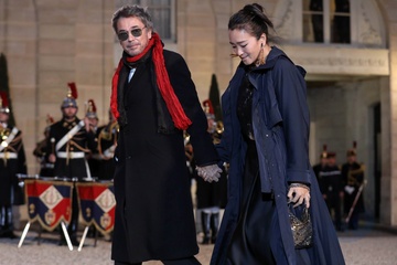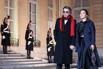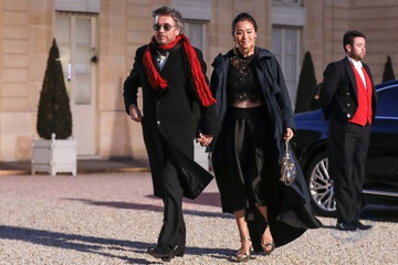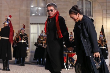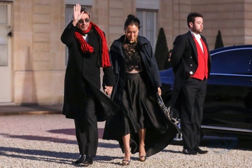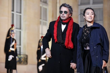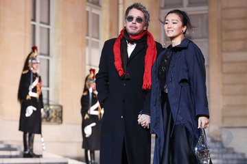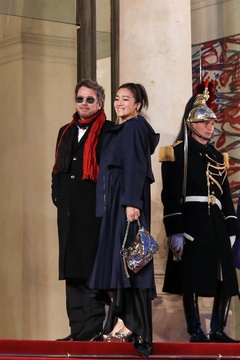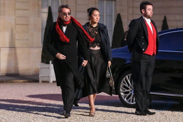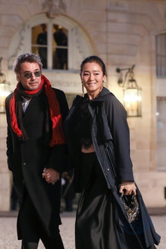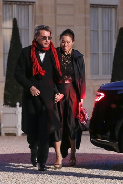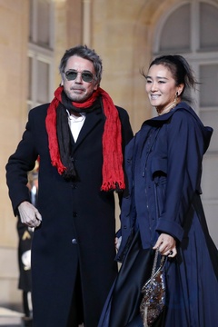 Jean-Michel Jarre ze swoja przyjaciolka Gong Li w drodze na przyjecie w Palacu Elizejskim
