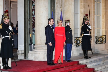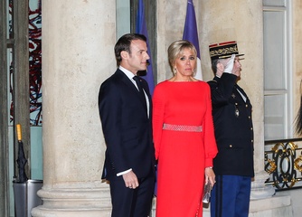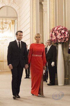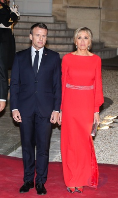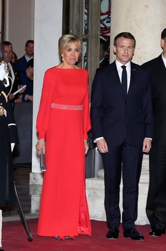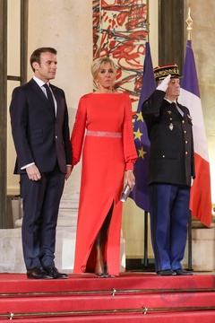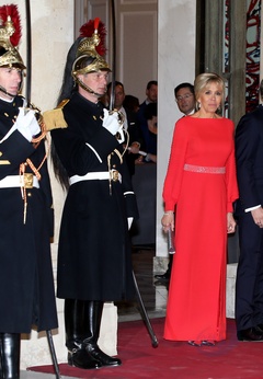 Brigitte Macron w czerwonej, eleganckiej sukience na przyjeciu w Palacu Elizejskim