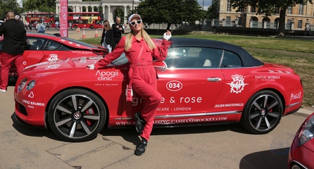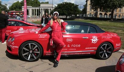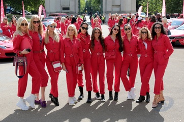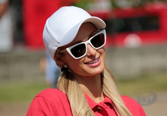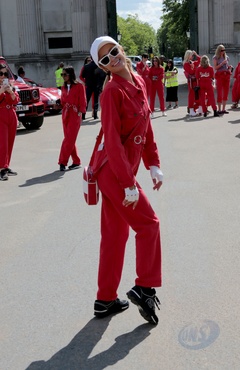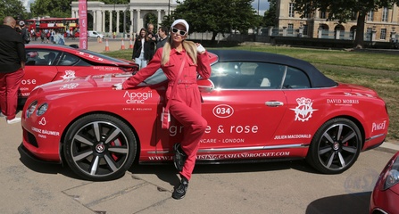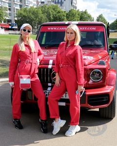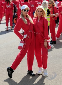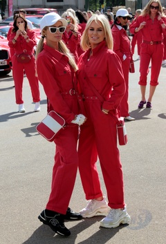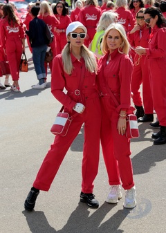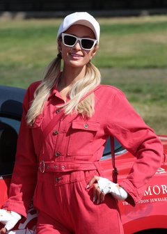 Paris Hilton w czerwonym kombinezonie na Cash & Rocket charity tour departure