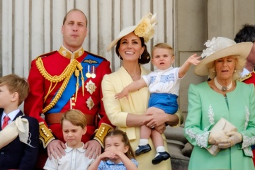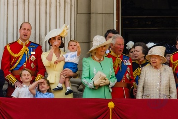 Ksiaze William, ksiezna Kate, Jerzy, Louis, ksiezniczka Charlotte, Camilla, Karol, Anna, krolowa Elzbieta