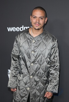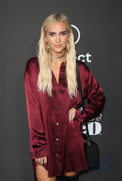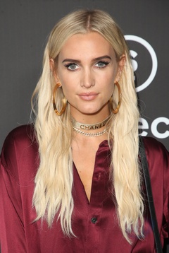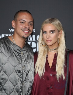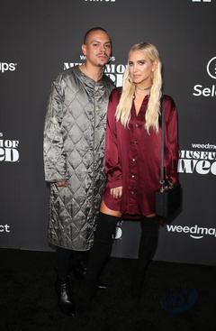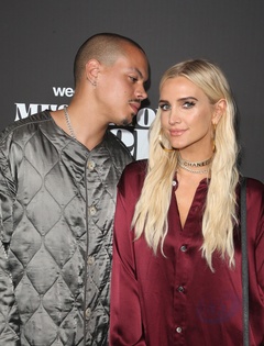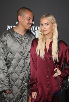 Ashlee Simpson w bordowej koszuli i jej maz w plaszczu na imprezie