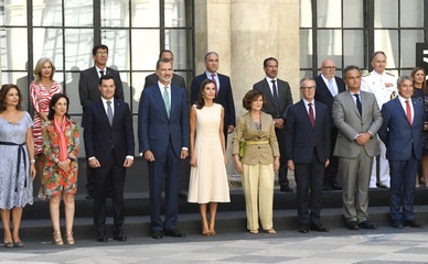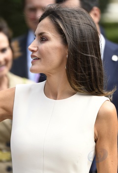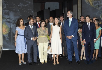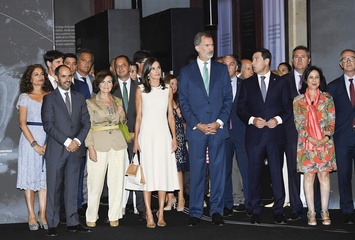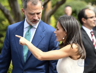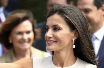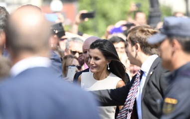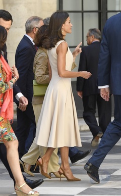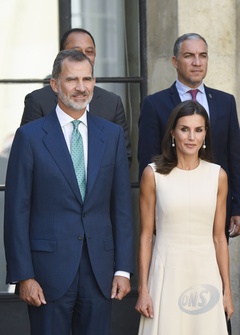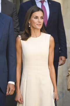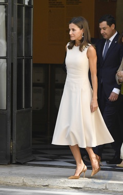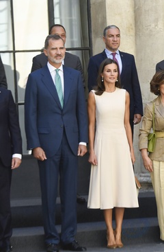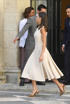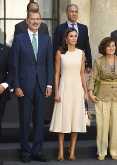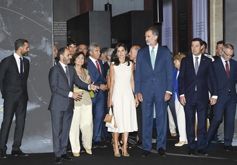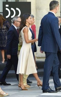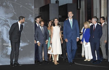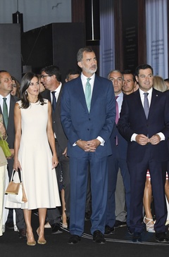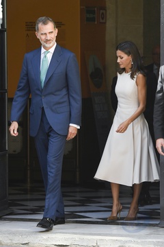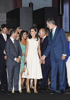 Krolowa Letizia w sukience ecru i krol Filip na wystawie The Longest Journey