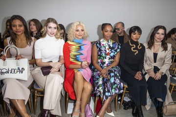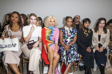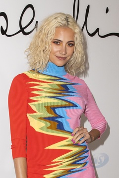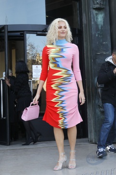 Pixie Lott w bardzo kolorowej sukience golfie na pokazie Schiaparelli