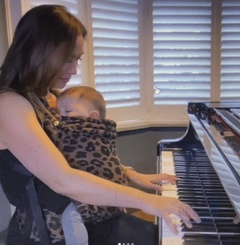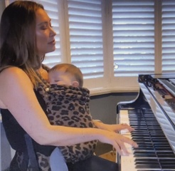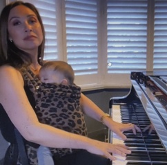 Myleen Klass z dzieckiem w chuscie gra na pianinie