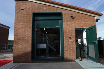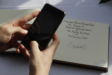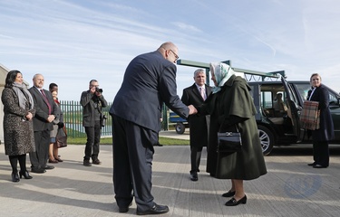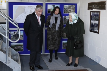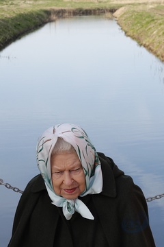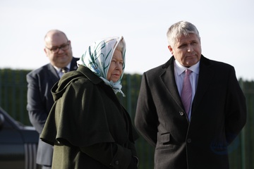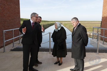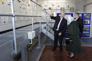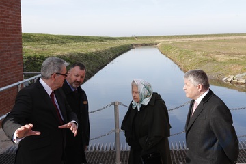 Krolowa Elzbieta II w chustce na glowie podczas wizyty w Wolferton Pumping Station w Norfolk
