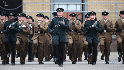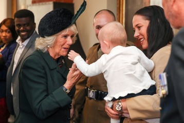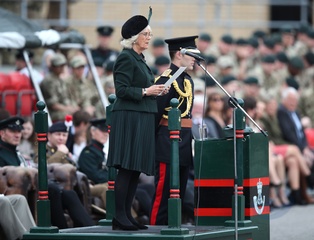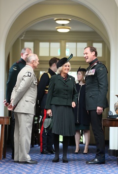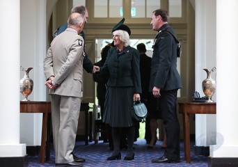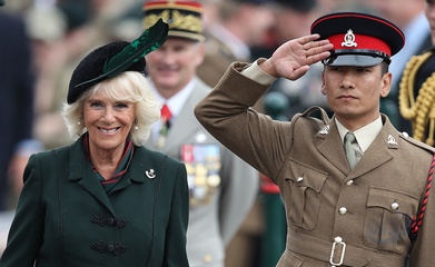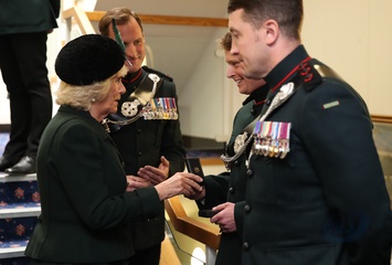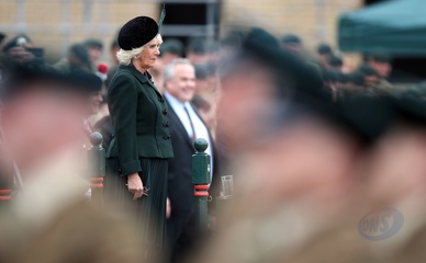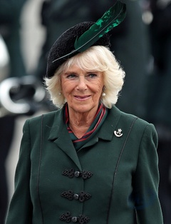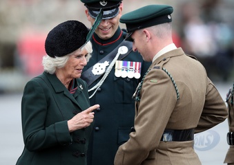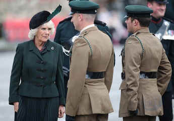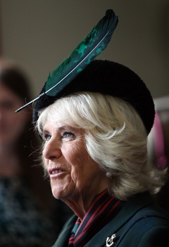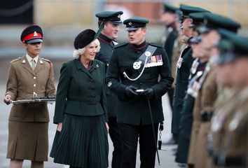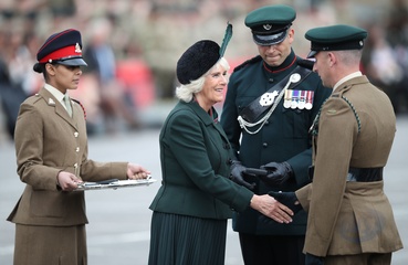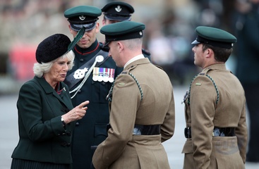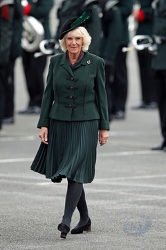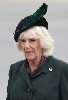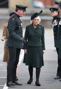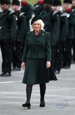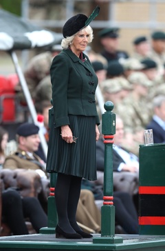 Ksiezna Camilla z duzym piorem na glowie na paradzie Battalion The Rifles