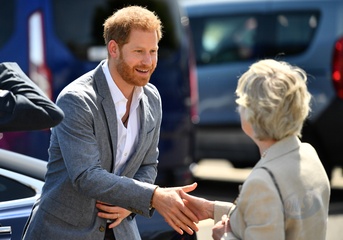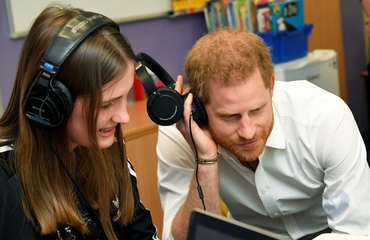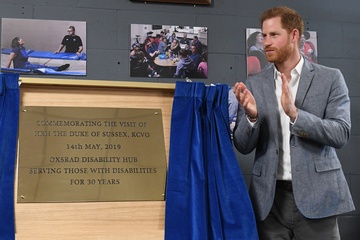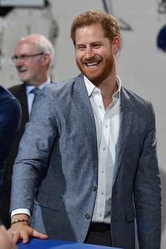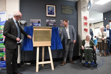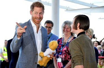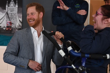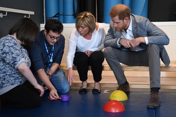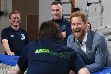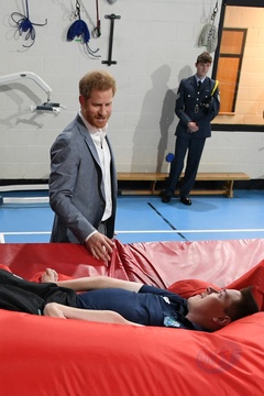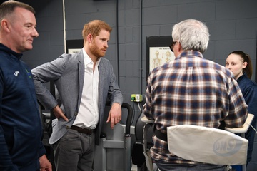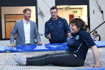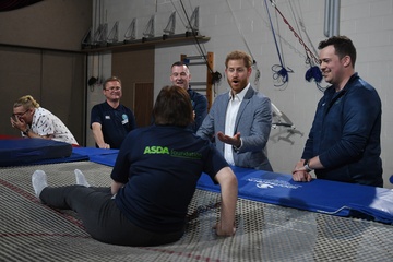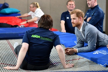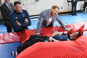 Usmiechniety i zadowolony KSIAZE HARRY podczas wizyty w OXSRAD Disability Sports and Leisure Centre
