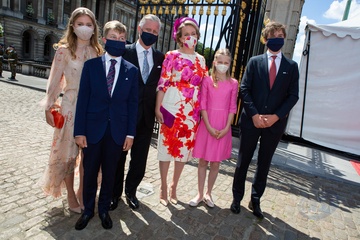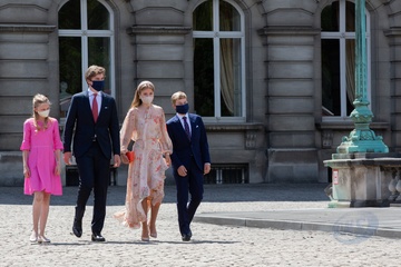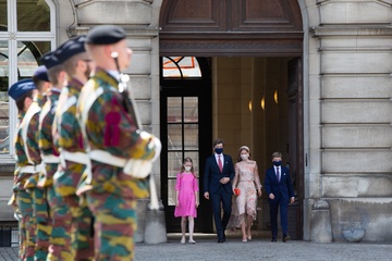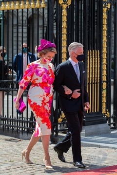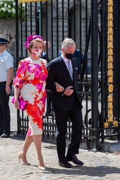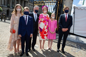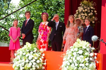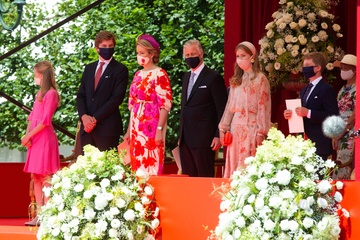 Krolowa Matylda w rozowo czerwonej sukience i jej rodzina podczas swieta narodowego Belgii