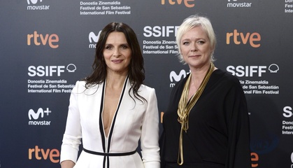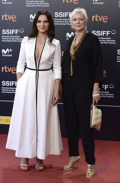 Juliette Binoche w bialej sukni na premierze Vision na festiwalu w San Sebastian