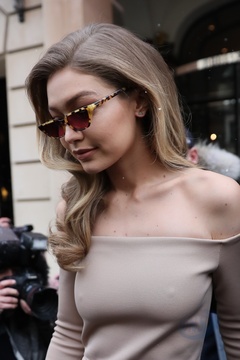 Gigi Hadid w szarej sukience bez stanika wychodzi z hotelu Royal Monceau