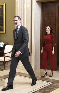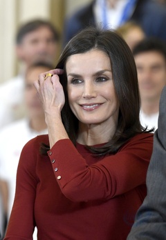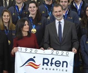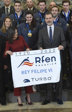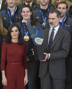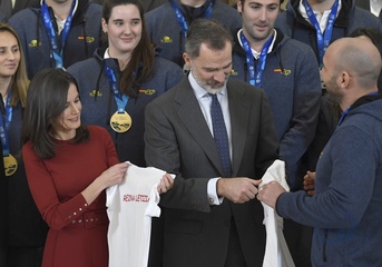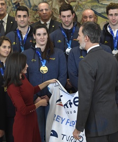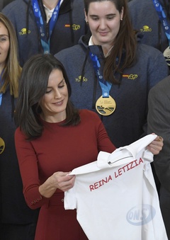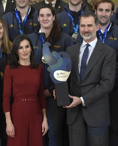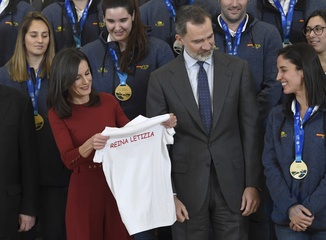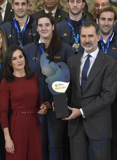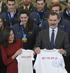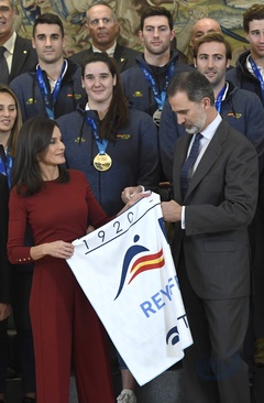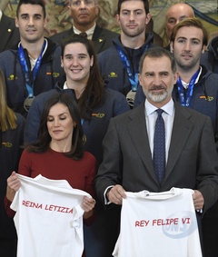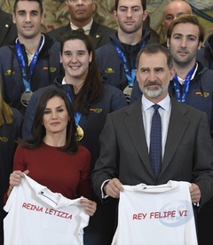 Letizia nabordowo i Filip podczas spotkania z narodowa druzyna waterpolo w Palacu Zarzuela