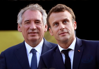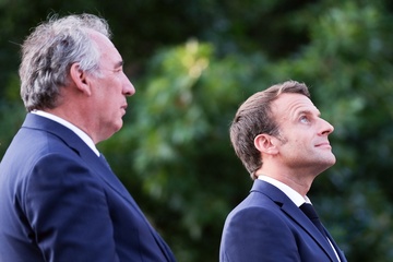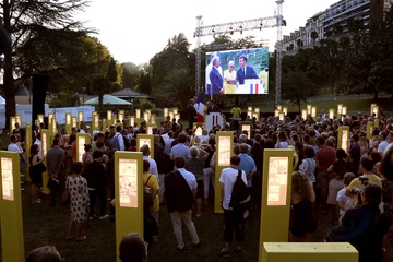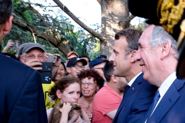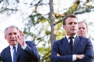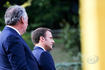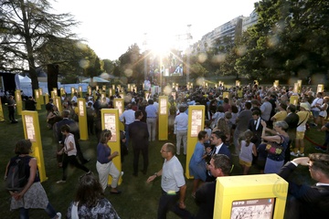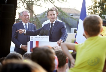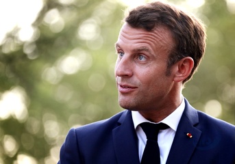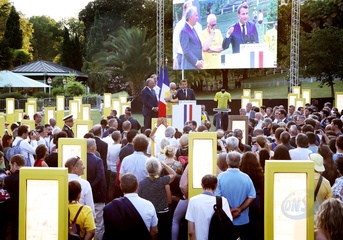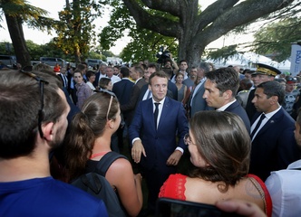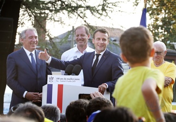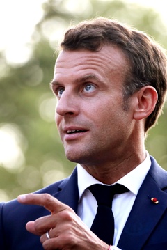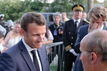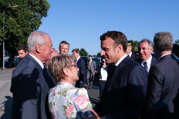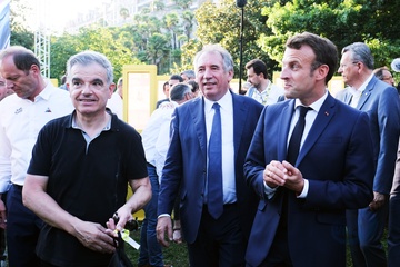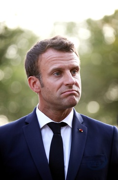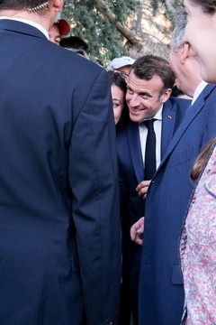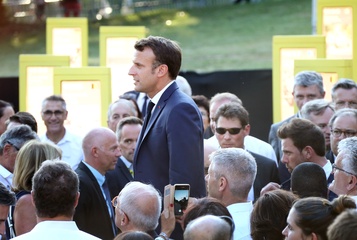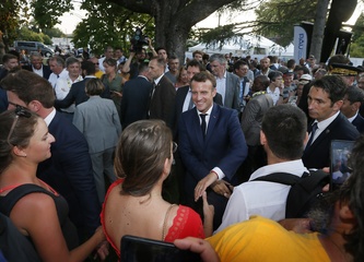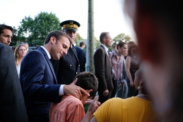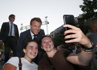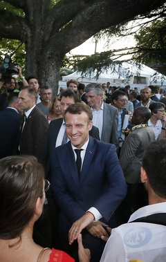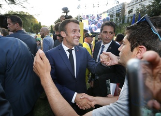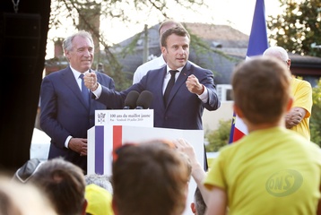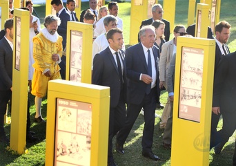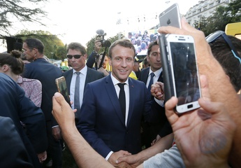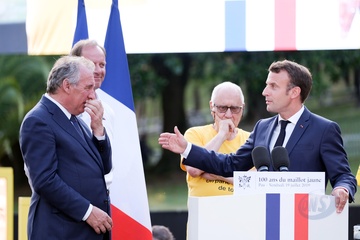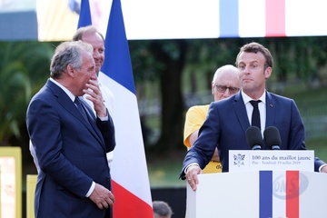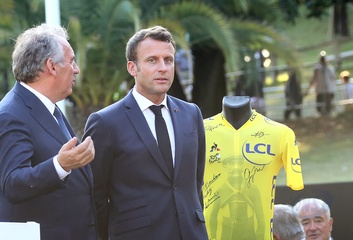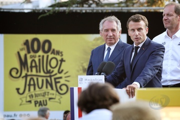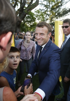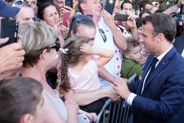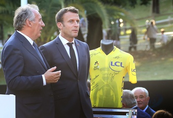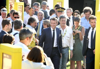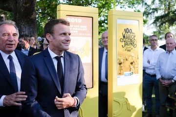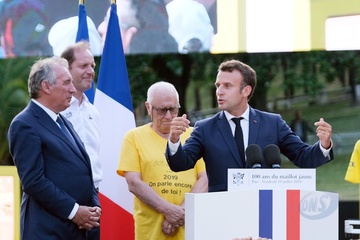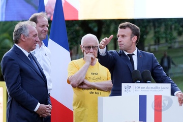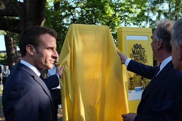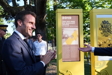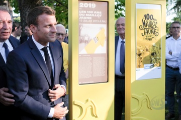 Macron pozuje do zdjec na ceremonii 100-lecia zoltej koszulki