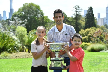 Novak Djokovic pozuje ze swoim trofeum w Krolewskich Ogrodach Botanicznych po wygraniu Australian Open 2020, Melbourne