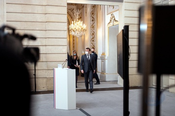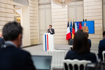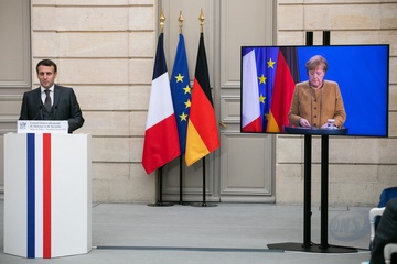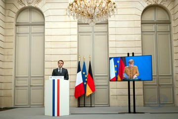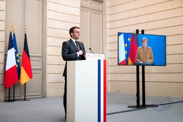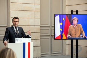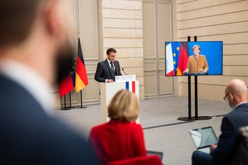 Emamnuel Macron i Angela Merkel podczas videokonferencji