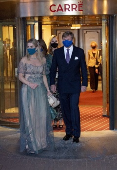 Krolowa Maxima i krol Willem Alexander z corkami przed teatrem