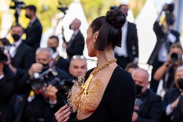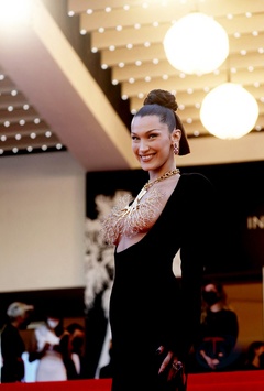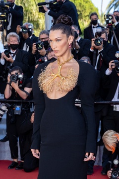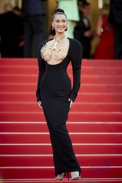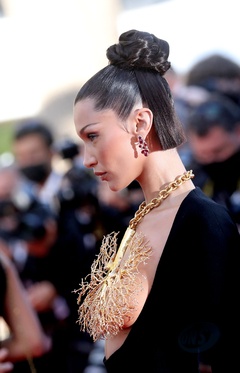 Cannes - Bella Hadid w dziwnej bizuterii - zastepuje stanik - czerwony dywan - Three Floors / Tre Piani