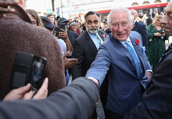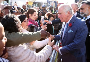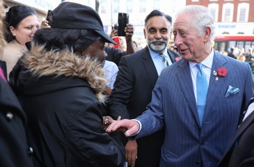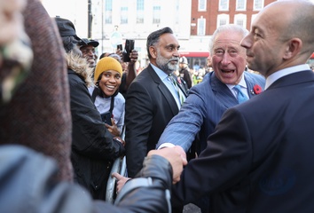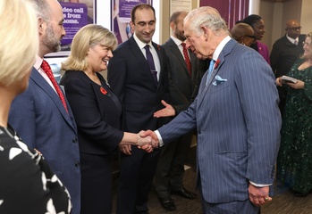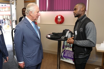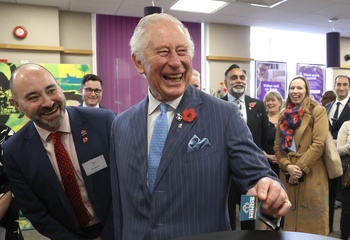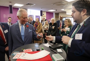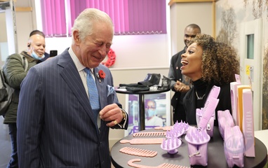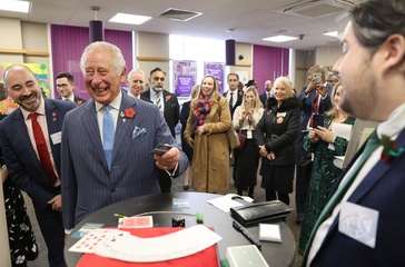Rozbawiony ksiaze Karol podczas The Prince's Trust Young Entrepreneurs