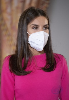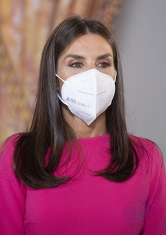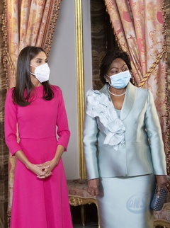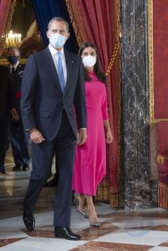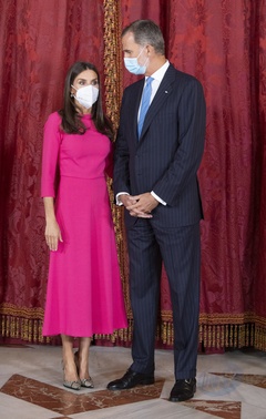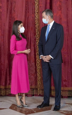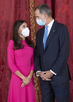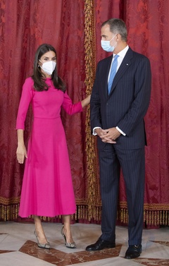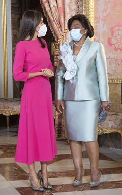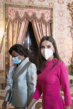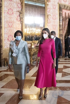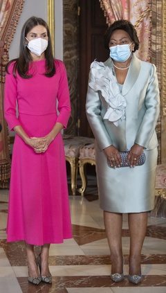 Krolowa Letizia w fuksjowej sukience podczas wizyty prezydenta Angoli