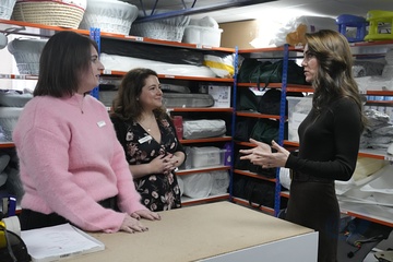 Kate Biancą Sakol założycielka Sebby's Corner zapewniajaca wsparcie rodzinom ogląda sprzęt i zabawki podczas jej wizyty w Sebby's Corner w północnym Londynie