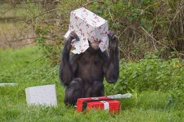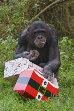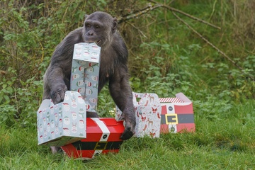Endangered chimpanzee explores Christmas boxes at Whipsnade Zoo