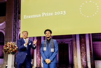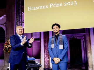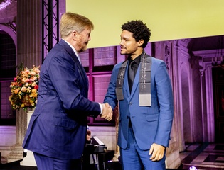 krol Willem-Alexander des Pays-Bas wręcza Trevorowi Noahowi Nagrodę Erasmusa w Pałacu Królewskim w Amsterdamie