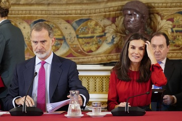 Król Felipe VI i królowa Letizia podczas spotkania zarządu Fundacji Księżnej Girony w Pałacu Królewskim w Madrycie