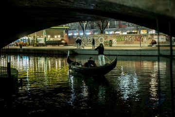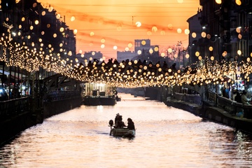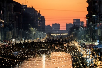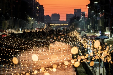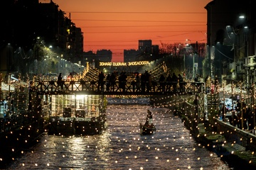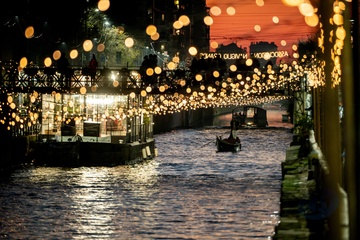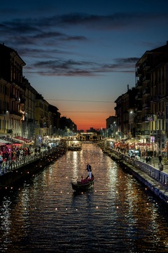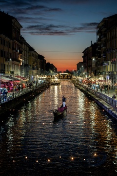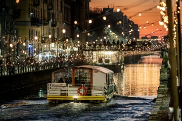 Christmas lights at sunset on the Naviglio Grande, Milan 16 Dec 2023