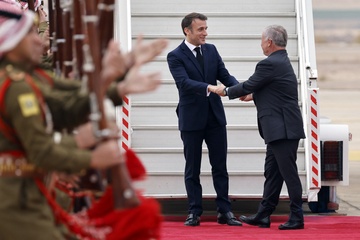 Król Jordanii Abdullah II wita Prezydenta Republiki Francuskiej Emmanuela Macrona po jego przybyciu na lotnisko w Akabie