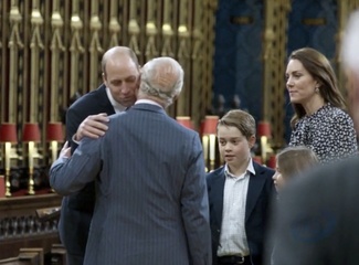 Król Anglii Karol III całuje księcia Williama i Kate Middleton z ich dzieci Jerzego Georga Charlotte Louisa