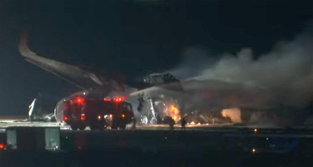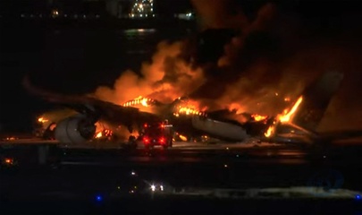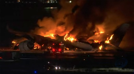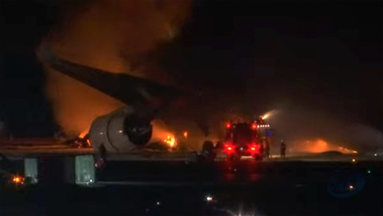 Samolot pasażerski zapala się po zderzeniu na lotnisku w Tokio
