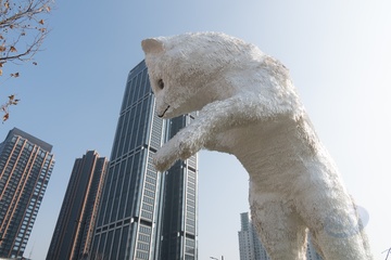 Widok na gigantyczną instalację artystyczną „Skaczmy!” stworzony przez holenderskiego artystę Florentijna Hofmana w Szanghaju