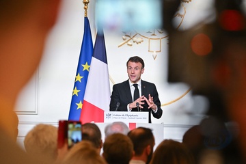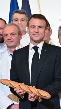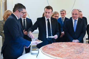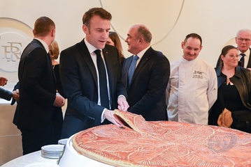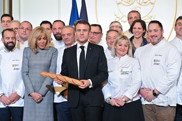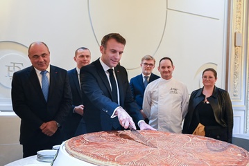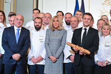 Prezydent Emmanuel Macron i jego żona Pierwsza Dama Brigitte Macron świętują Święto Trzech Króli tradycyjną galette des rois w Pałacu Elizejskim w Paryżu 15