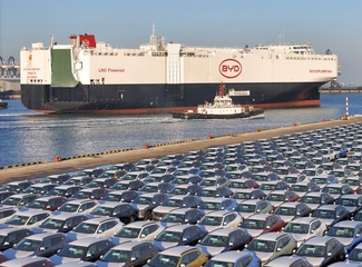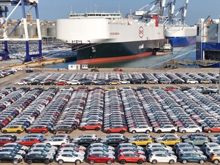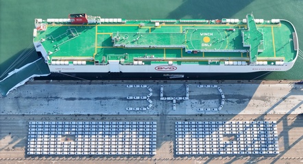 Nowe samochody czekają na załadunek na nowo ukończony statek ro-ro o nazwie BYD Explorer No.1