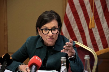 Penny Pritzker prowadzi konferencję prasową w Kijowie