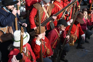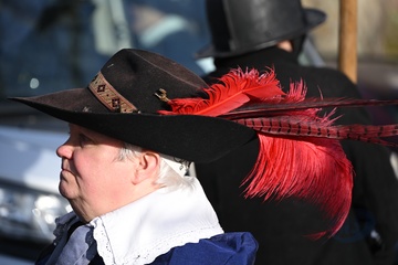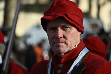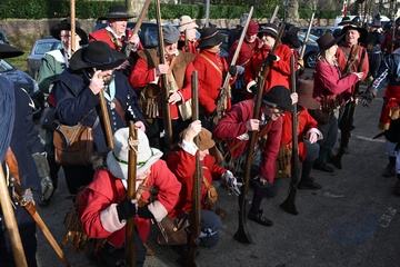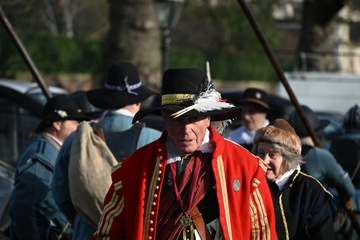 Rekonstruktorzy angielskiej wojny domowej maszerują wzdłuż centrum handlowego do Horseguards w Londynie, Wielka Brytania, 28 stycznia 2024 r.