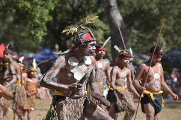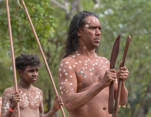 Indigenous Australian men holding traditional weapons during a ceremonial dance in Cape York Queensland Australia
