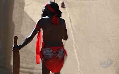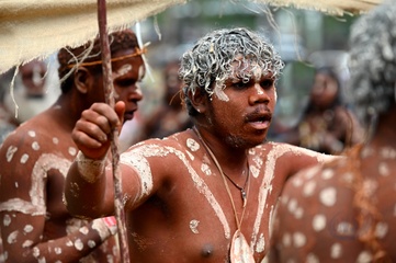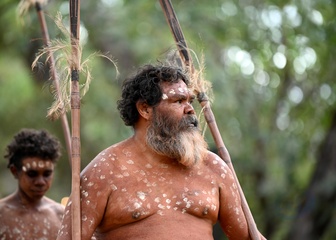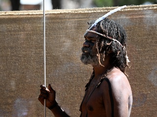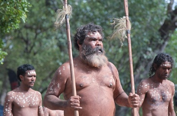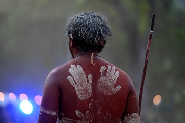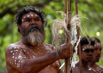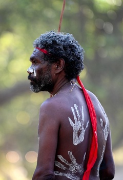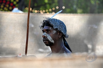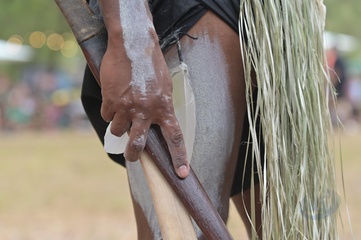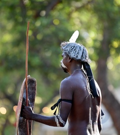 Indigenous Australian man holding traditional weapons during a ceremonial dance in Cape York Queensland Australia