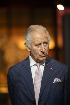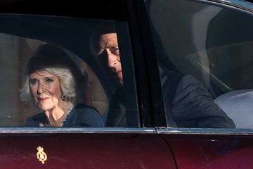 Le roi Charles III d'Angleterre et Camilla Parker Bowles, reine consort d'Angleterre, accueillis par le président de la République française Emmanuel Macron et la première dame Brigitte Macron sur le parvis de Notre-Dame de Paris