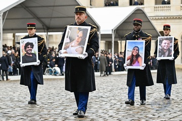 Cérémonie d’hommage national aux victimes françaises des attaques terroristes du 7 octobre en Israël dans la cour d’honneur de l’Hôtel national des Invalides