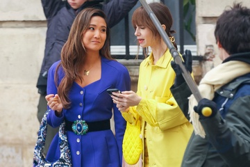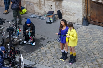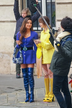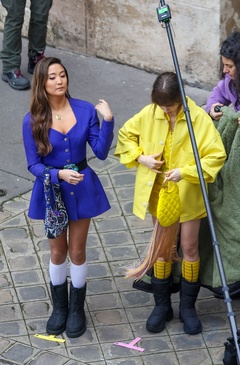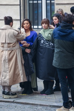 Semi-exclusif - Première apparition de l'actrice Ashley Park, depuis son hospitalisation pour un choc septique, pendant le tournage de la saison 4 de série Netflix "Emily in Paris" avec la co-star Lily Collins dans les rues de Paris